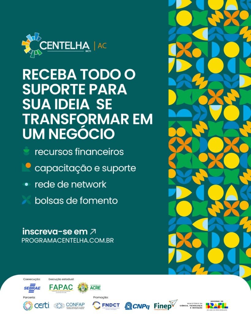 Referência nacional no incentivo ao empreendedorismo inovador, o Programa Centelha está com inscrições abertas no Acre. Com investimento previsto de R$ 1,6 milhão no estado, o programa é executado pela Fundação de Amparo à Pesquisa do Acre (FAPAC), coexecutado pelo Sebrae Acre.