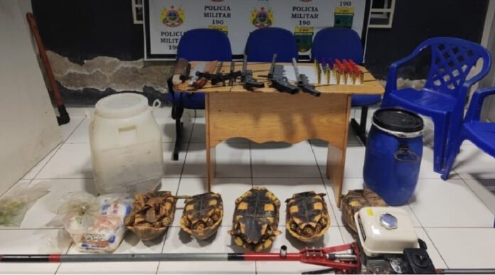 A ação resultou ainda na apreensão de cinco armas de fogo de fabricação artesanal, munições e diversos instrumentos usados na atividade de caça. Os suspeitos relataram que estavam na área há cerca de cinco dias realizando a prática ilegal.