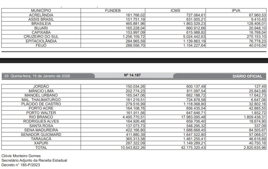 A Lei Complementar nº 63, de 11 de janeiro de 1990 estabelece a obrigatoriedade de publicação mensal do demonstrativo da distribuição da arrecadação estadual com valores arrecadados e transferidos aos municípios acreanos. Por isso, que a Secretaria de Estado da Fazenda do Acre (Sefaz) publicou no Diário Oficial desta quinta-feira (15) uma tabela com números referentes a dezembro de 2025.