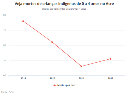 O relatório do Conselho Indigenista Missionário (Cimi), divulgado no último dia 26, mostra que o Acre tem o quinto maior número de mortes de óbitos de crianças indígenas entre 0 e 4 anos em 2022. Os estados que registraram o maior número de óbitos de crianças indígenas entre 0 e 4 anos em 2022 foram Amazonas (233), Mato Grosso (133) e Roraima (128).