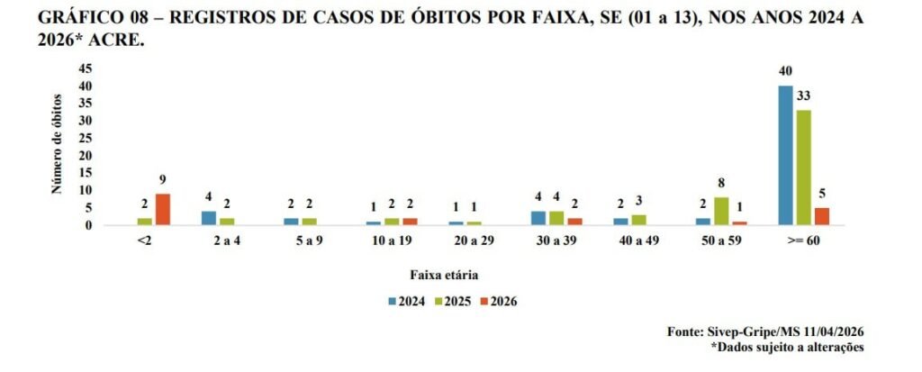 O Acre registrou 19 óbitos por Síndrome Respiratória Aguda Grave (SRAG) entre as semanas epidemiológicas 1 e 14 de 2026, com dados atualizados até 11 de abril. Apesar da redução em relação ao mesmo período de anos anteriores, quando foram contabilizadas 56 mortes em 2024 e 57 em 2025, o boletim da Secretaria de Estado de Saúde (Sesacre) aponta mudanças relevantes no perfil das vítimas.