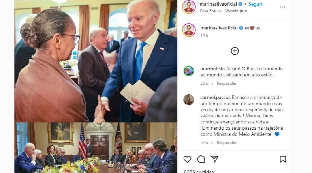 Em fotos da reunião publicadas por Marina, é possível ver a acreana sentada em uma mesa com o alto escalão do governo americano.