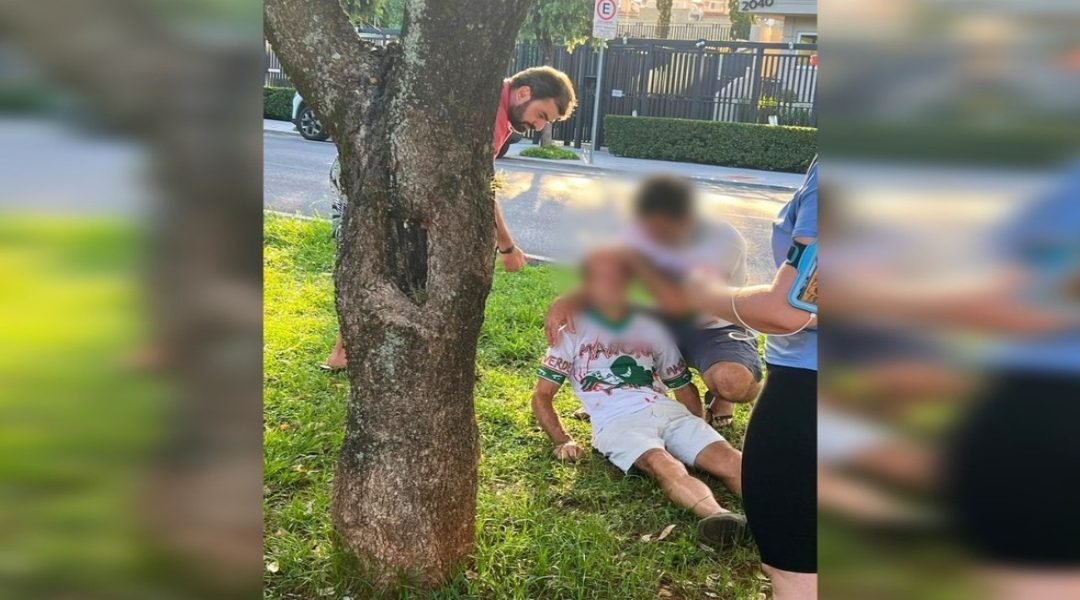 Celso foi agredido com um soco e ficou desacordado. Em seguida, a vítima foi fotografada caída no gramado, com os olhos fechados, e sendo amparada por um homem. O suspeito aparece atrás de uma árvore na imagem (veja acima).