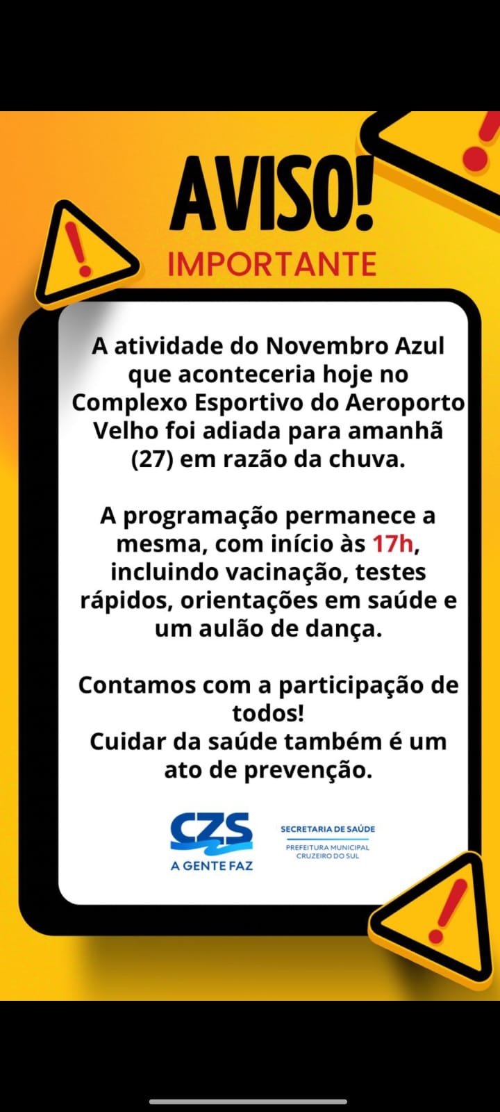 A ação do Novembro Azul que estava prevista para acontecer nesta terça-feira (26) no Complexo Esportivo do Aeroporto Velho, em Cruzeiro do Sul, foi adiada para amanhã, dia 27. A decisão foi tomada pela Secretaria Municipal de Saúde em razão da forte chuva registrada na cidade, que impossibilitou a realização das atividades programadas.
