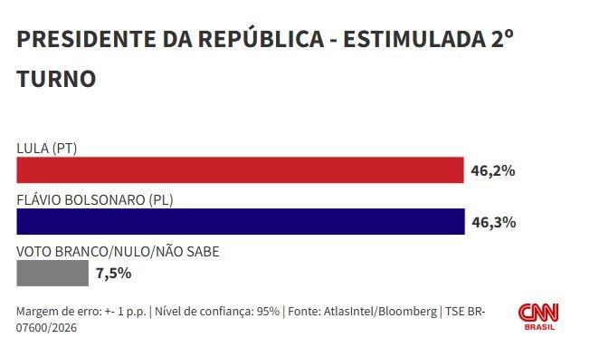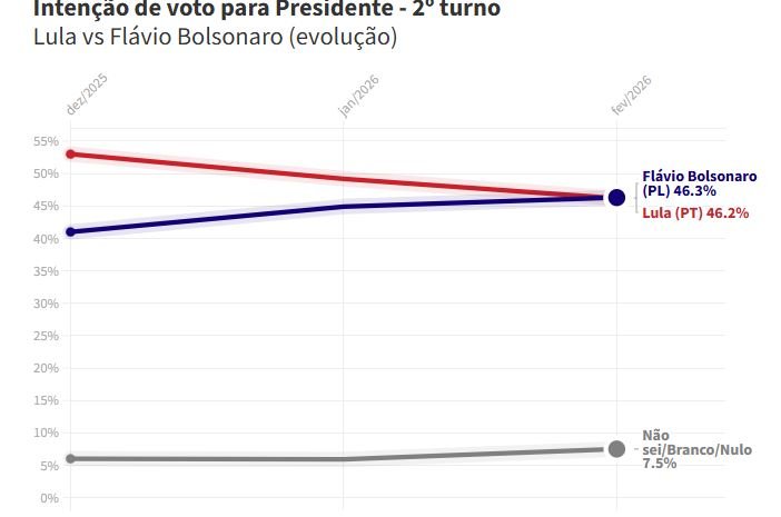 Flávio aparece com 46,3% — em janeiro, ele tinha 44,9%. Lula, por sua vez, tem 46,2%, antes tinha 49,2%.