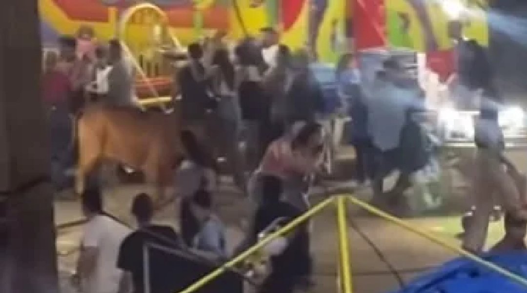 Em um dois vídeos, é possível ver o animal correndo entre pessoas e brinquedos, inclusive, chegando a atingir uma mulher, que fica caída no chão. É possível ver, também, vários homens atrás do bovino, na tentativa de segurá-lo e evitar maiores problemas.