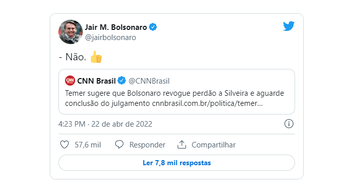 Em resposta, Bolsonaro utilizou as suas redes sociais para responder ao ex-vice de Dilma Rousseff e negar a sugestão. “Não”, publicou Jair em seu Twitter. O indulto cedido a Daniel Silveira – condenado por atos antidemocráticos e ameaças a ministros da Corte – já foi motivo de ação impetrada no STF pela Rede Sustentabilidade. O partido pede uma liminar que suspenda os efeitos do decreto presidencial enquanto o plenário da Corte não vote a legalidade do ato. Após sorteio, a ministra Rosa Weber foi a escolhida para ser a relatora do pedido realizado pela oposição.