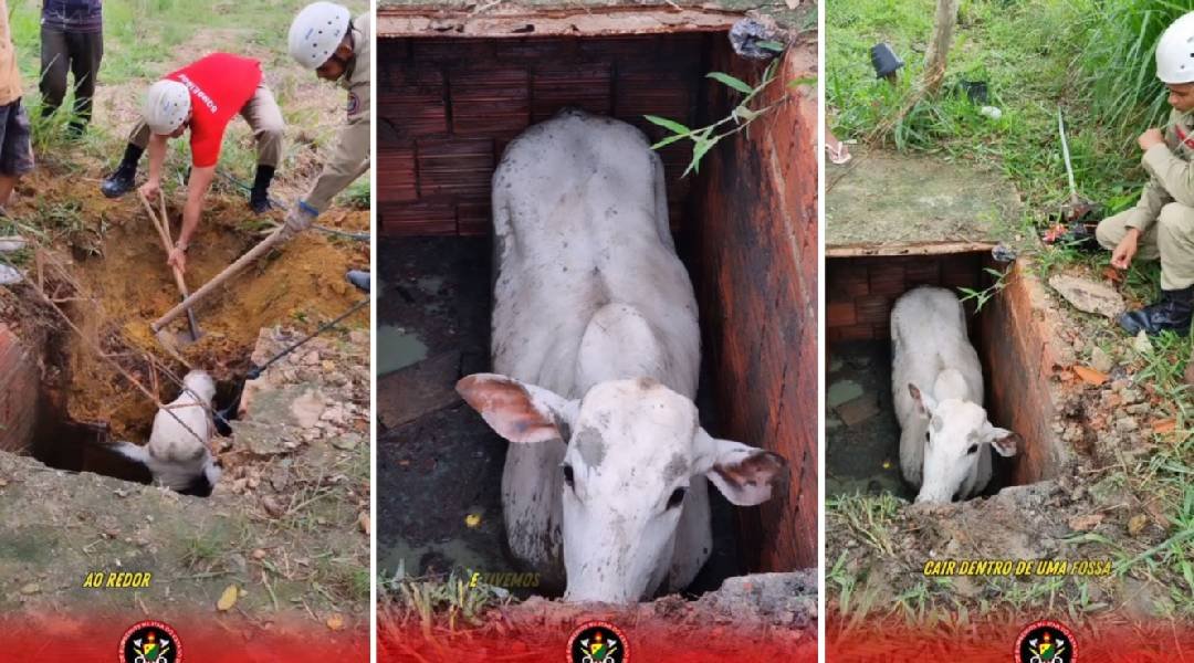O Corpo de Bombeiros foi acionado para atender a uma ocorrência de resgate de um boi que havia caído em uma fossa, no bairro Nova Olinda, próximo à cidade da Justiça, em Cruzeiro do Sul.
