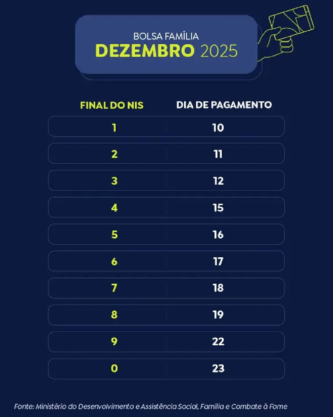 No modelo tradicional do Bolsa Família, o pagamento ocorre nos últimos dez dias úteis de cada mês. No entanto, por causa das festas de fim de ano, o calendário de dezembro é antecipado em cerca de dez dias, para dar tempo de os benefícios serem depositados antes do Natal.