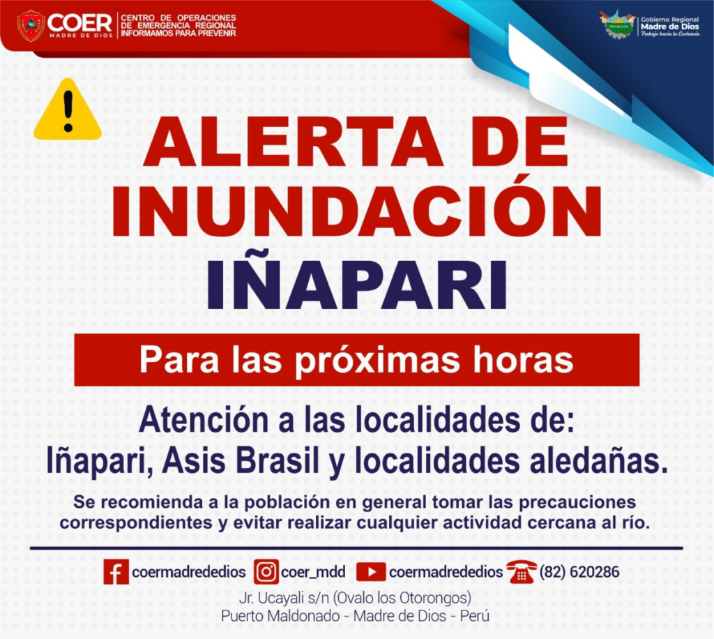 O alerta foi feito para as cidades de Iñapari, no Peru, e Assis Brasil, no Acre, além de cidades vizinhas. O alerta foi publicado no perfil do Facebook do COER Madre de Dios.