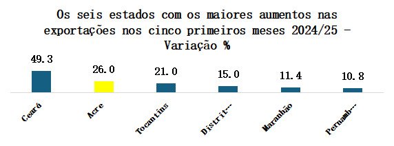 As exportações acreanas atingiram US$ 52,4 milhões nos primeiros cinco meses do ano (janeiro a maio de 2025), superando em 26% o valor exportado no mesmo período de 2024 (US$ 41,6 milhões). Com esse resultado, o Acre figura como o segundo maior crescimento entre os estados da federação.