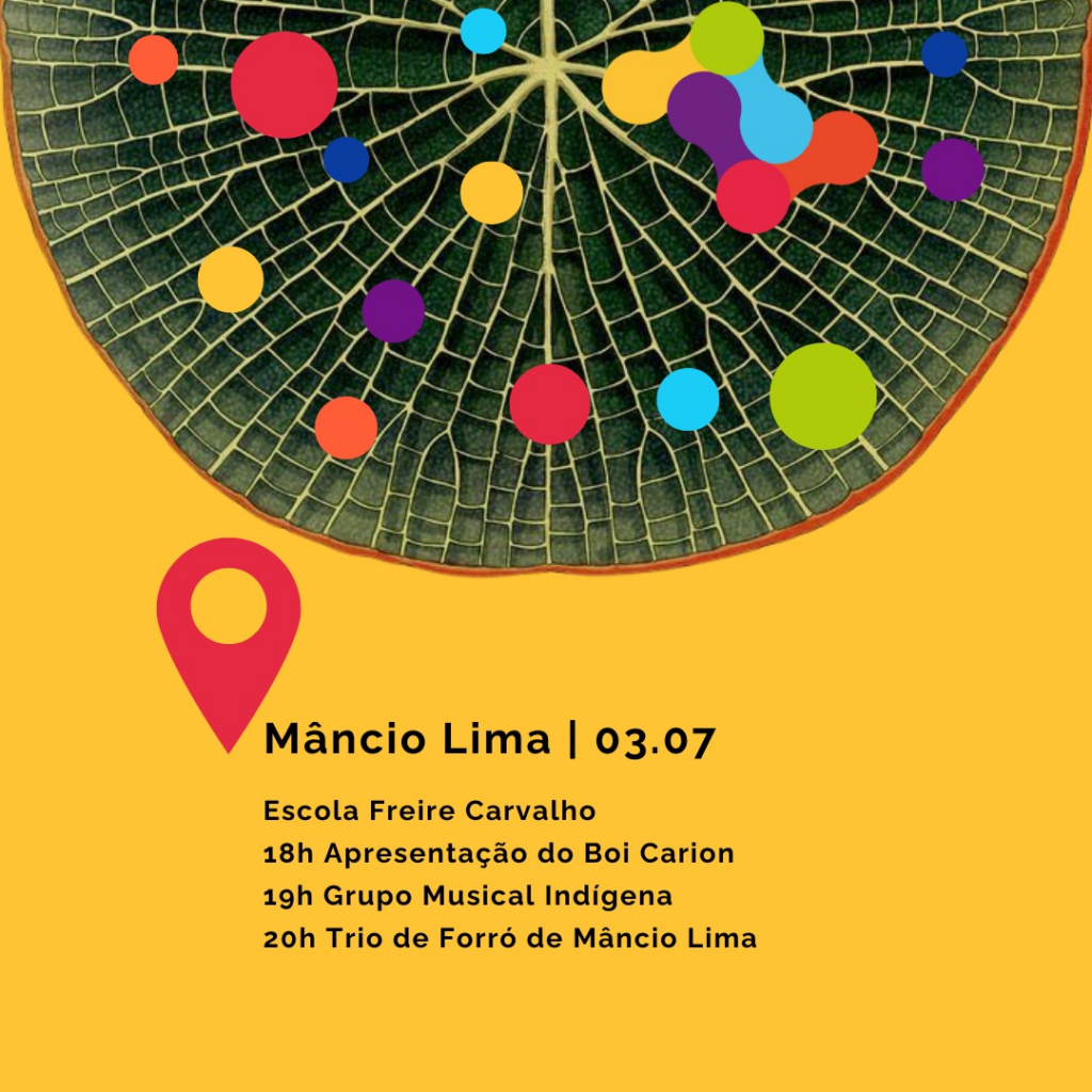18h Apresentação do Boi Carion / 19h Grupo Musical Indígena / 20h Trio de Forró de Mâncio Lima com Note da Sanfona, Armed da Zabumba e Franklin do Triângulo