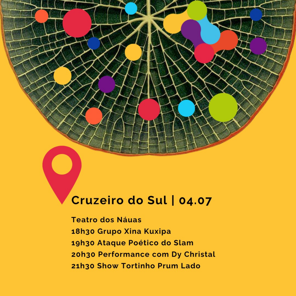 18h30 Grupo Xina Kuxipa com Elissandro kaxinawá, Elimar kaxinawá, Ocimar kaxinawá, Aparecida kaxinawá, Jocileia kaxinawá, Thayná kaxinawa, Gracineide kaxinawá, Cleidiane kaxinawa / 19h30 Ataque Poético do Slam com Karen Loiane, Órion Mc e Sidinha / 20h30 Performance com Dy Christal / 21h30 Show Tortinho Prum Lado com Yan Lucas e Fernando;