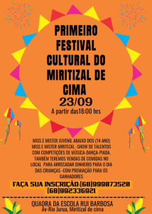 A comunidade do Miritizal de Cima está se preparando para o seu Primeiro Festival Cultural. O evento está marcado para acontecer no dia 23 de setembro, a partir das 18:00 horas, na quadra da Escola Rui Barbosa, localizada na Av. Rio Juruá.