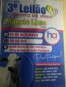 No próximo dia 15 de dezembro, o município de Mâncio Lima será palco do último leilão “Direito de Viver”, destinado a arrecadar fundos para o Hospital do Amor, que oferece tratamento gratuito a pacientes com câncer. O evento acontecerá no bairro São Francisco, em frente à Igreja Matriz, a partir das 10 horas da manhã.