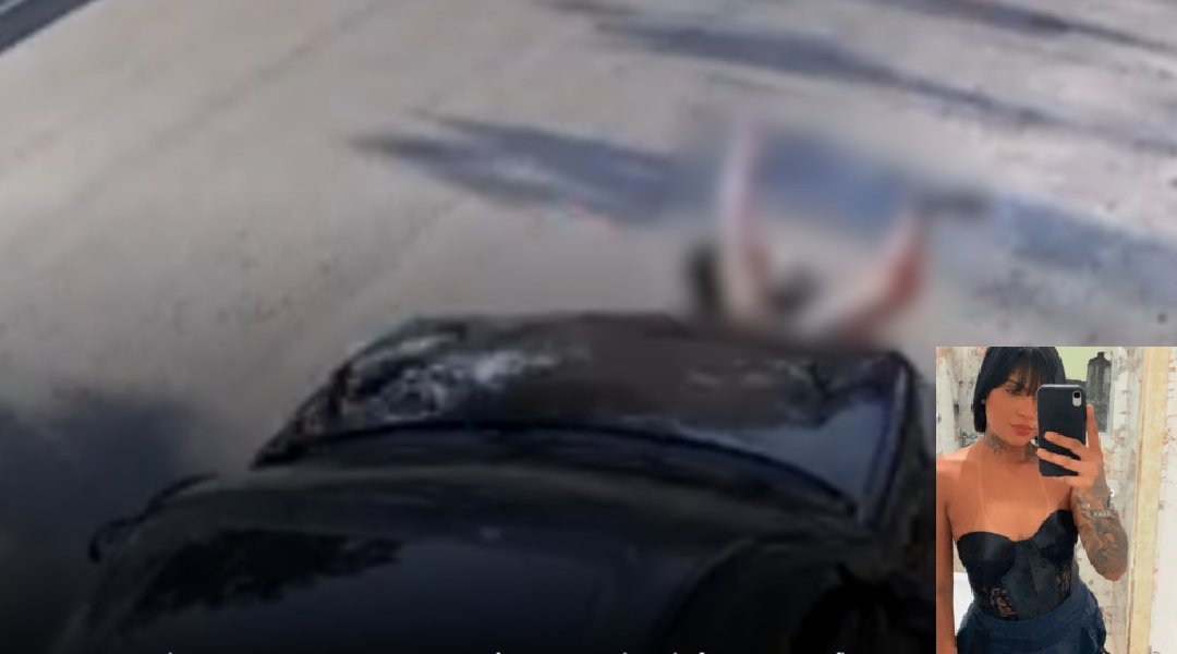 O motorista não só atropela, mas passa por cima da mulher com o carro e a arrasta pela rua.