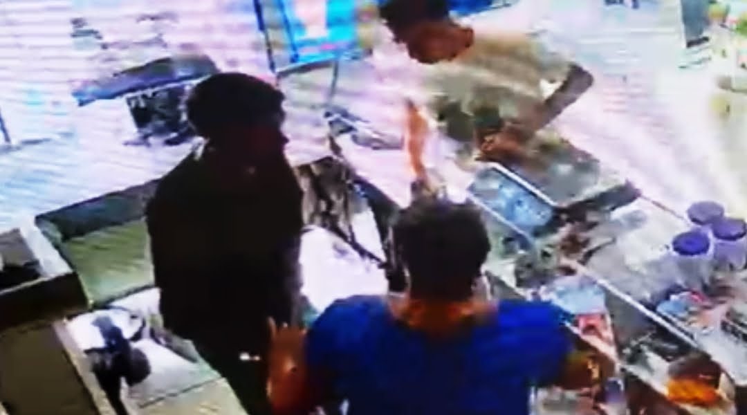 As imagens mostram dois indivíduos, ambos armados com facas, abordando uma funcionária do mercantil localizado na entrada do bairro São José.