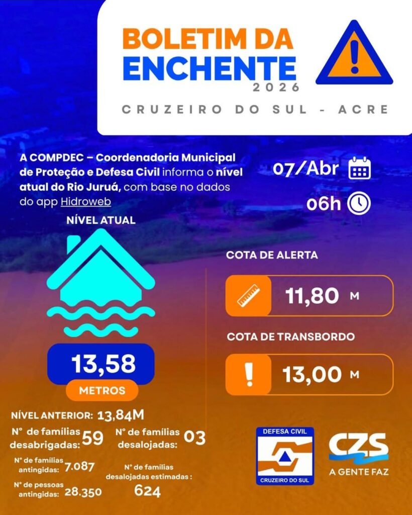 De acordo com o boletim divulgado pela Coordenadoria Municipal de Proteção e Defesa Civil (Compdec) na manhã desta terça-feira (7), às 6h, o rio marcou 13,58 metros. Apesar da redução em relação à medição anterior, que era de 13,84 metros, o nível ainda permanece acima da cota de transbordo, fixada em 13,00 metros.