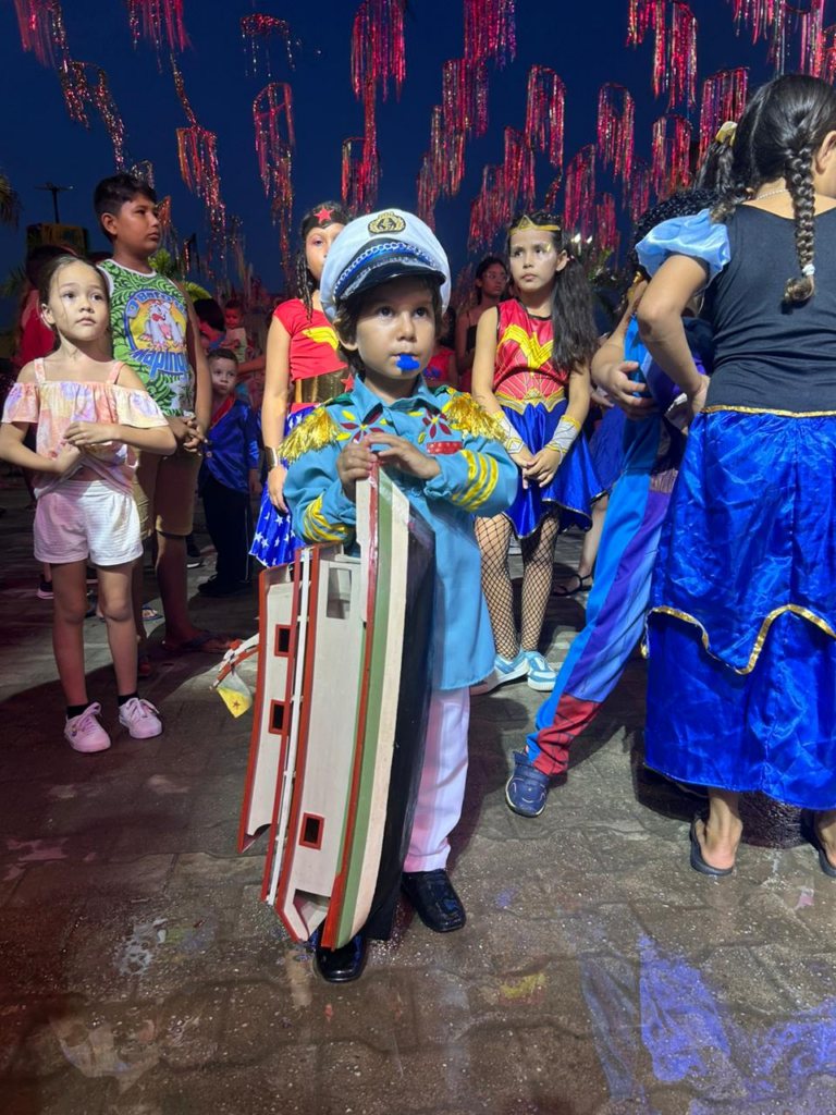 Thiago Araujo, responsável pela participação de seu filho, explicou a inspiração por trás da fantasia do pequeno Arthur, que se vestiu de marujo em homenagem à cultura local, especialmente ao marujeiro José Soares, que já faleceu. Arthur, apaixonado por água e barcos, expressou sua empolgação com a fantasia, “O marujo navega o barco pelas aguas, eu gosto muito de barco e água”.