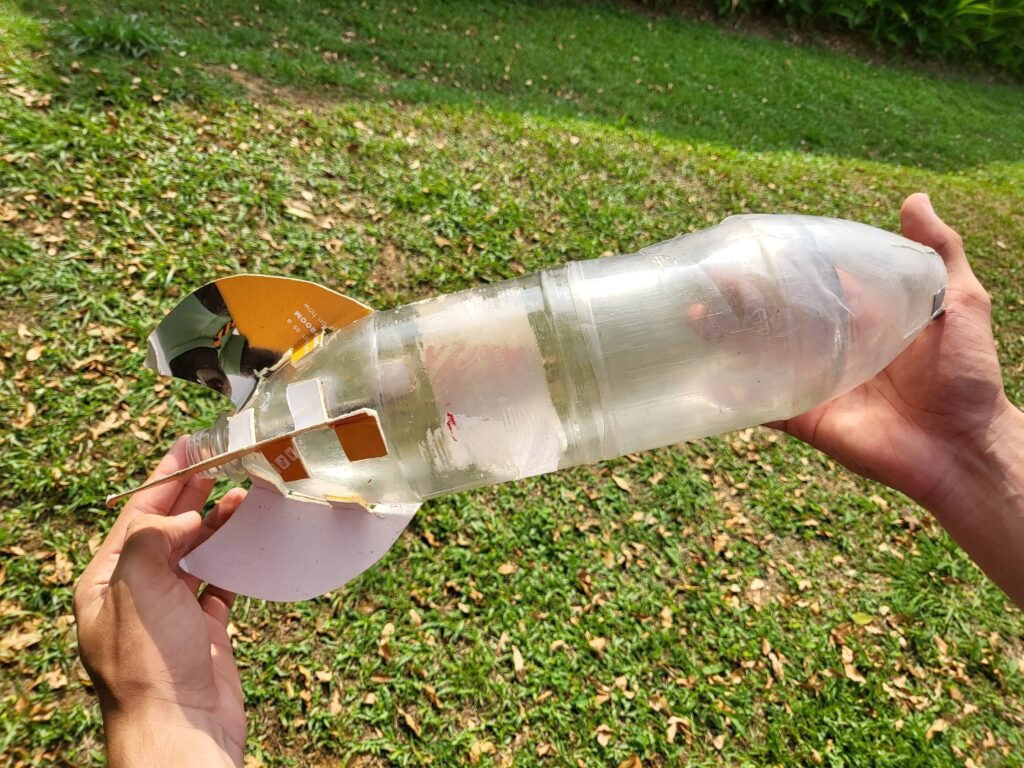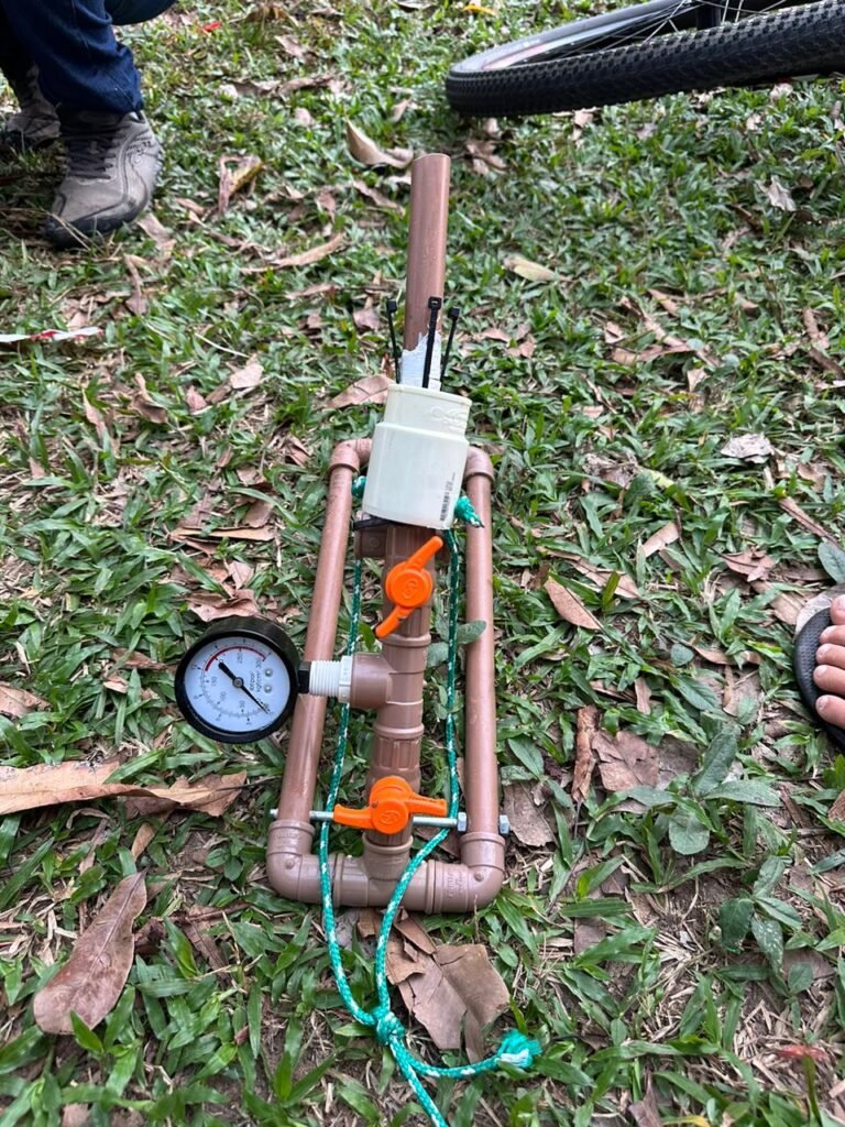 Artur Cavalcante, um dos estudantes e membro da equipe, explica que a base é montada utilizando canos de PVC, além de contar com dois registros para liberar pressão em caso de o foguete não decolar, e outro para liberar o arpão. Além disso, um medidor de pressão é usado para determinar o momento ideal para puxar a corda. O foguete é montado utilizando uma garrafa PET reciclável.