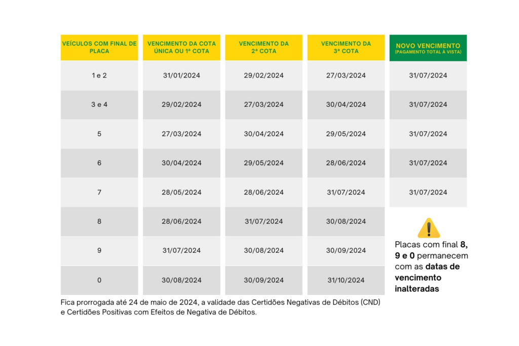 Com isso, os prazos para o pagamento do IPVA à vista, com vencimentos até o último dia útil de janeiro, fevereiro, março, abril e maio de 2024, foram estendidos até 31 de julho de 2024, permitindo que os contribuintes evitem multas ao pagar até essa data.