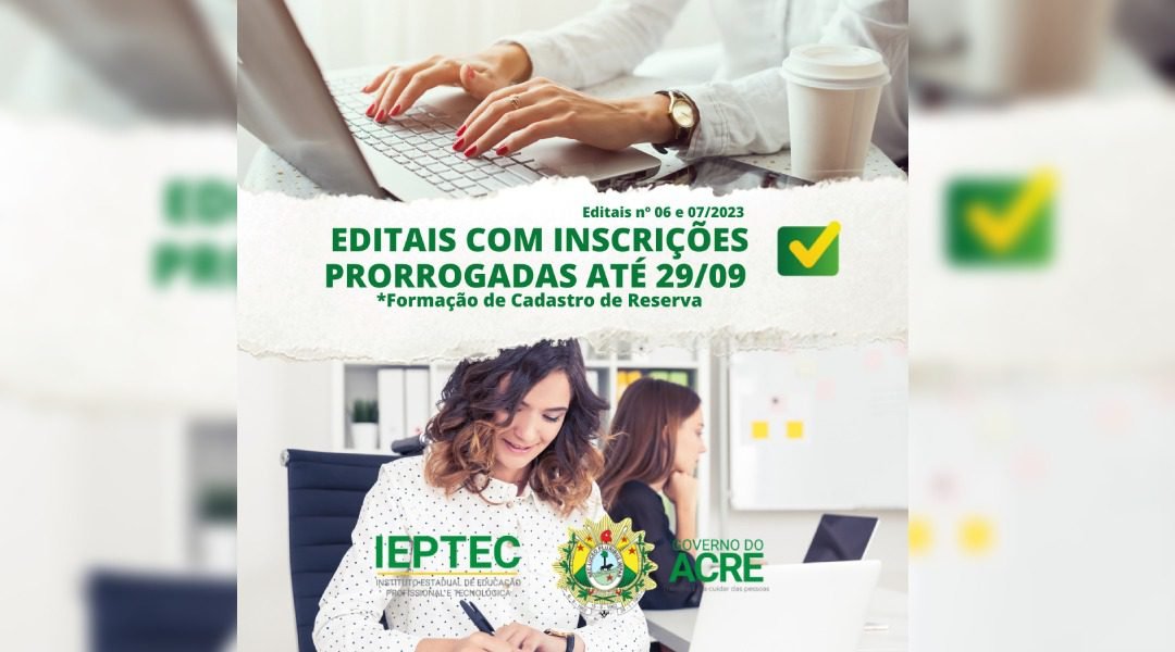 O governo do Acre, por meio do Instituto Estadual de Educação Profissional e Tecnológica (Ieptec), publicou no Diário Oficial de terça-feira, 26, informações sobre a prorrogação de dois processos seletivos para formação de cadastro de reserva. O edital nº 06/2023, com vagas para o cargo de Profissional Bolsista Docente Mensalista, e o edital nº 07/2023, para o cargo de Profissional Bolsista Não Docente Mensalista, estão com inscrições abertas até 29 de setembro.