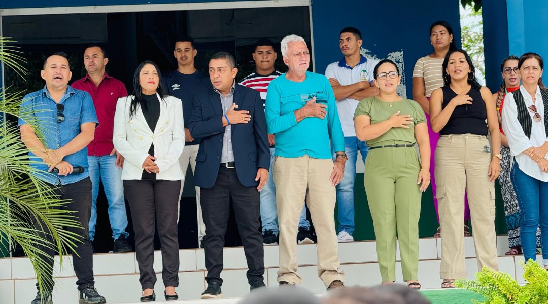O hasteamento dos pavilhões – nacional, estadual e municipal – foi conduzido pelo prefeito César Andrade, pela Coordenadora do Núcleo de Educação Estadual, Fabiana Pedrosa, e pela vereadora Cleide Silva, que acompanhados por um grupo de estudantes que representaram todas as escolas da rede pública de ensino.