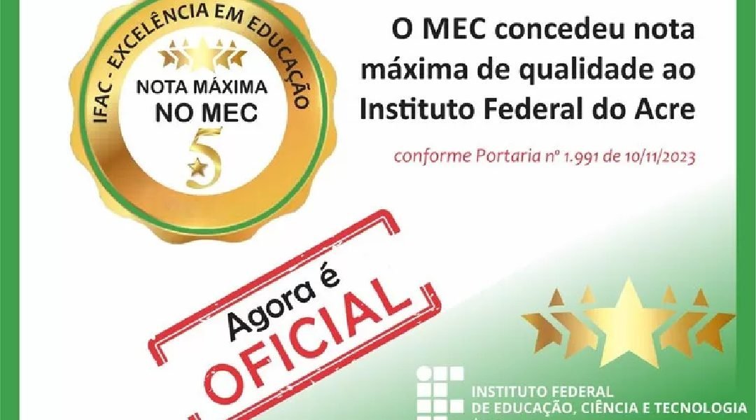 O Instituto Federal de Ciência e Tecnologia do Acre (Ifac) recebeu nota 5 na avaliação institucional realizada em dezembro de 2021, pelo Instituto Nacional de Estudos e Pesquisas Anísio Teixeira (Inep), ligado ao Ministério da Educação e Cultura — MEC.