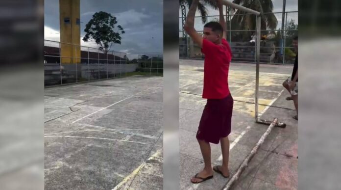 Moradores do Miritizal, em Cruzeiro do Sul, denunciaram neste sábado (25), a situação de abandono de uma quadra esportiva localizada no bairro. A reclamação ganhou repercussão após a circulação de um vídeo nas redes sociais, em que jovens aparecem improvisando a estrutura do local para conseguir utilizá-lo