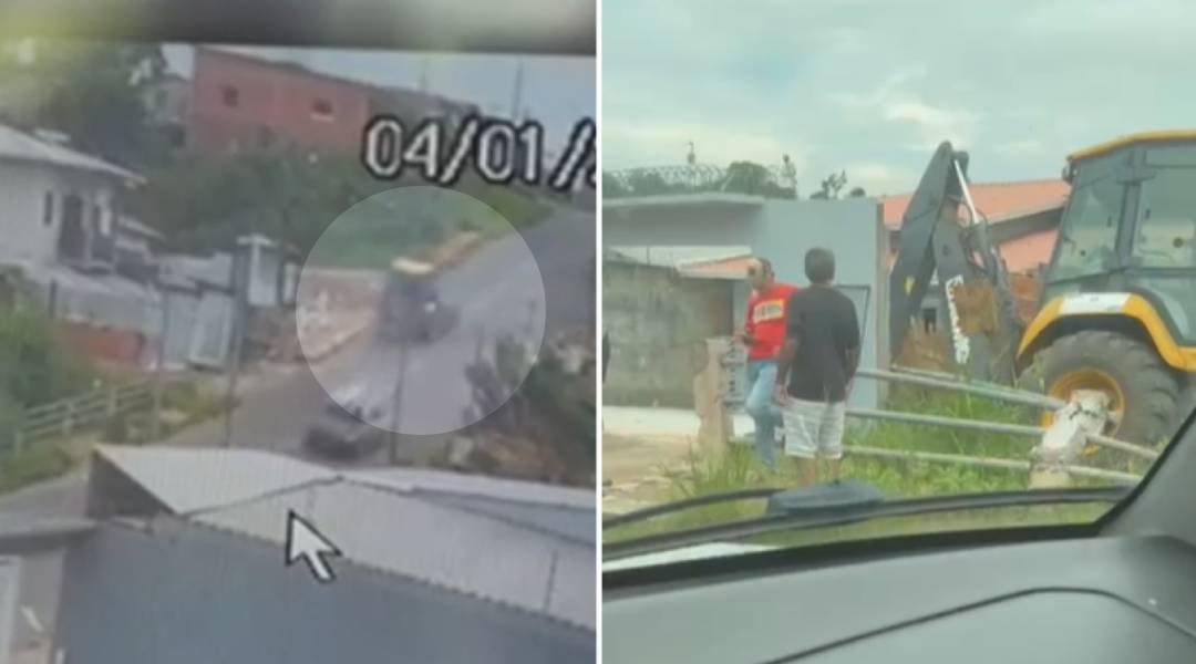 Registros de câmeras de segurança na região captaram o momento exato em que a retroescavadeira iniciou sua descida. As imagens mostram o veículo deslizando pela ladeira até atingir o muro da casa.