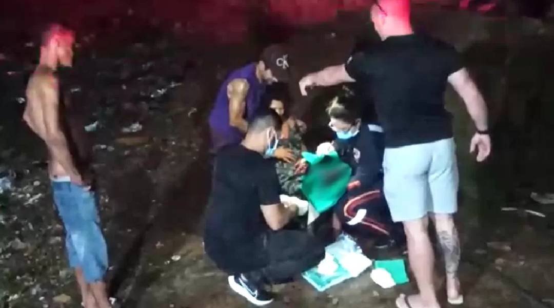 A equipe de Samu teve dificuldade em acessar o terreno abandonado e, mesmo assim, com auxílio de uma escada, conseguiu pular o muro e ajudar a mulher a terminar o parto e receber atendimento.