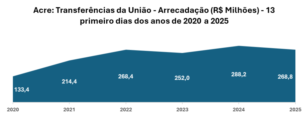 | Acre: Transferências da União – Demonstrativo da Distribuição da Arrecadação (em R$), nos primeiros 13 primeiros dias dos anos de 2024 e 2025 | ||||