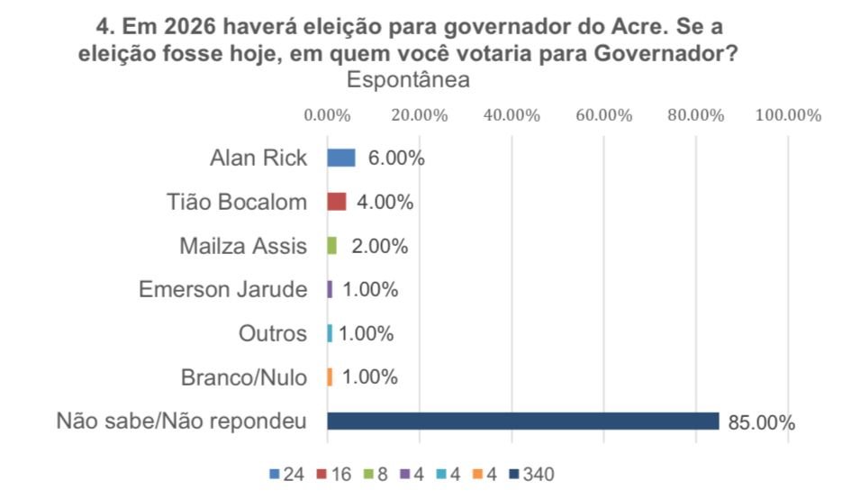 Na disputa para o governo, na pesquisa espontânea, quando os nomes dos candidatos não são apresentados, o senador Alan Rick aparece com 6% das intenções de voto. Em seguida vem o prefeito de Rio Branco, Tião Bocalom, com 4%. A vice-governadora Mailza Assis tem 2%, e o deputado estadual Emerson Jarude, 1%. A pesquisa apresentou um alto número de indecisos: 85% não souberam ou não responderam.