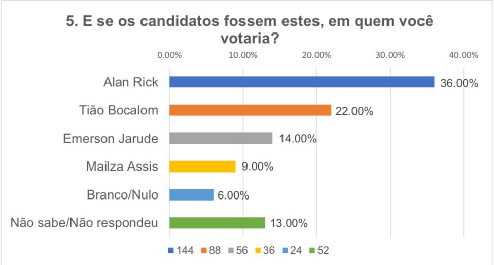 Quando os nomes foram apresentados, Alan Rick lidera com 36%, seguido por Tião Bocalom, com 22%. Emerson Jarude aparece com 14%, e Mailza Assis soma 9%. Brancos, nulos e indecisos representam 19%.