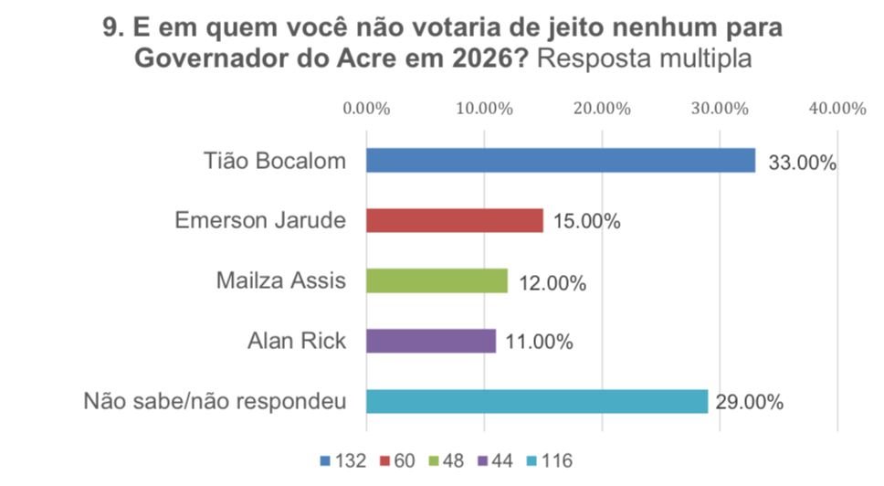 No quesito rejeição, Tião Bocalom lidera com 33%. Depois vêm Emerson Jarude, com 15%, Mailza Assis, com 12%, e Alan Rick, com 11%.