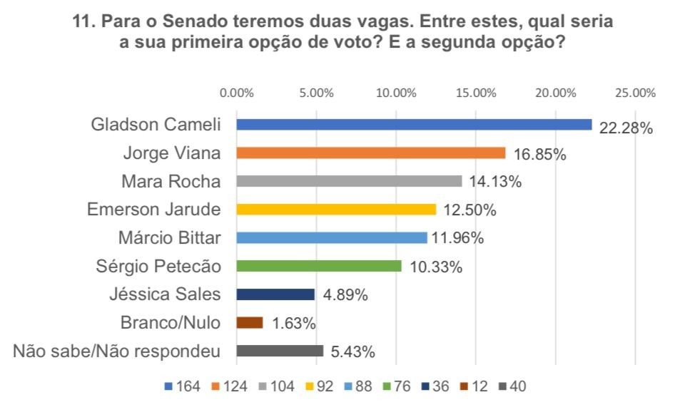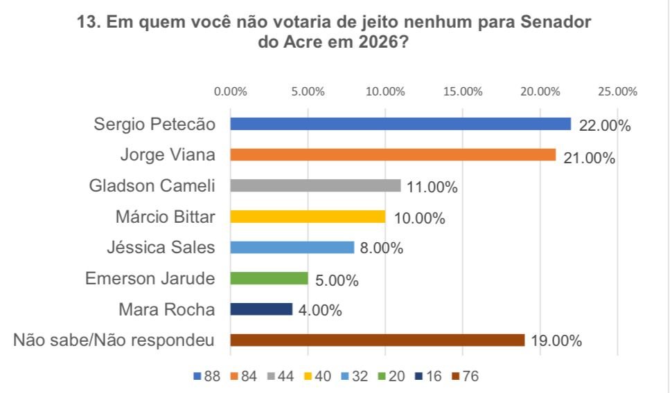 Na rejeição para o Senado, Sérgio Petecão lidera com 22%, seguido de Jorge Viana, com 21%, Gladson Cameli, com 11%, Márcio Bittar, com 10%, Jéssica Sales, com 8%, Emerson Jarude, com 5% e Mara Rocha, com 4%.