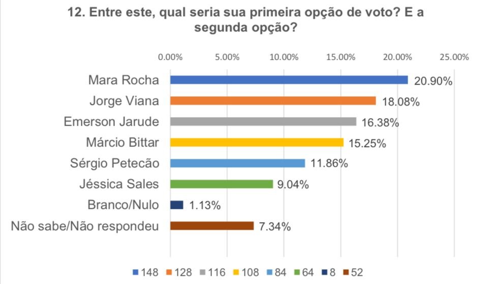 Já para o segundo voto, Mara Rocha lidera com 20,90%. Jorge Viana aparece com 18,08%, seguido de Emerson Jarude, com 16,38%, Márcio Bittar, com 15,25%, Sérgio Petecão, com 11,86%, e Jéssica Sales, com 9,04%. Brancos, nulos e indecisos totalizam 8,47%.