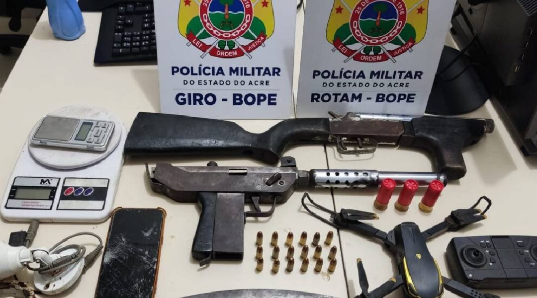 Os militares conseguiram lograr êxito em encontrar os autores adentrando em uma residência, onde nas buscas foram localizadas uma submetralhadora 9 milímetros com 18 munições, uma espingarda calibre 12 com três munições, um drone, câmera de segurança e duas balanças de precisão. Um dos presos era foragido da justiça.
