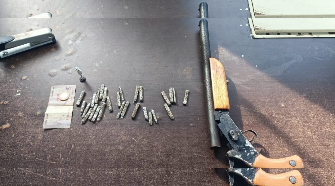 Os suspeitos, ao avistarem os policiais, arremessaram barras de maconha e uma arma de fogo ao solo, e fugiram do local. A guarnição recolheu 25 barras de maconha e uma escopeta calibre 16.