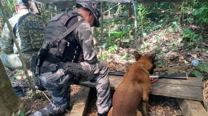 Durante o patrulhamento e incursão em área de mata, os policiais identificaram um abrigo improvisado (tapiri). Um indivíduo que estava no local conseguiu fugir ao perceber a presença da equipe. Para auxiliar nas buscas, foi empregado o cão policial K-9 Thor, especializado na detecção de armas e entorpecentes, que indicou positivamente um ponto próximo ao abrigo.