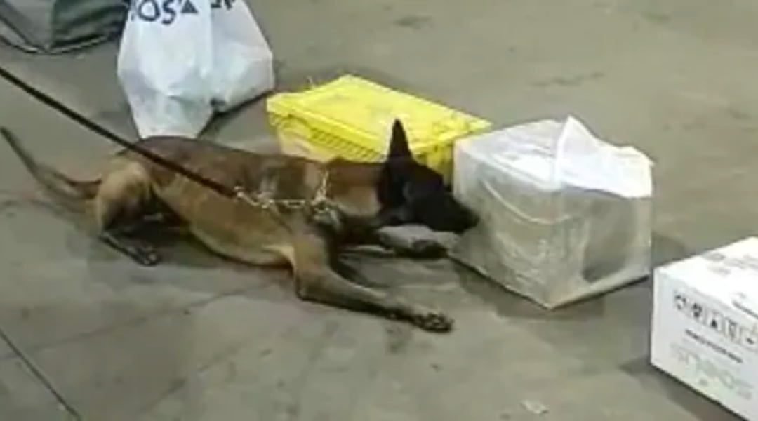 Os cães encontraram uma caixa no pátio de despacho de cargas dos Correios. A carga estava enrolada em papel filme, guardada dentro de balões plásticos e misturada com pedaços de canela. Para dissimular o cheiro da droga, os suspeitos sujaram a carga de graxa.