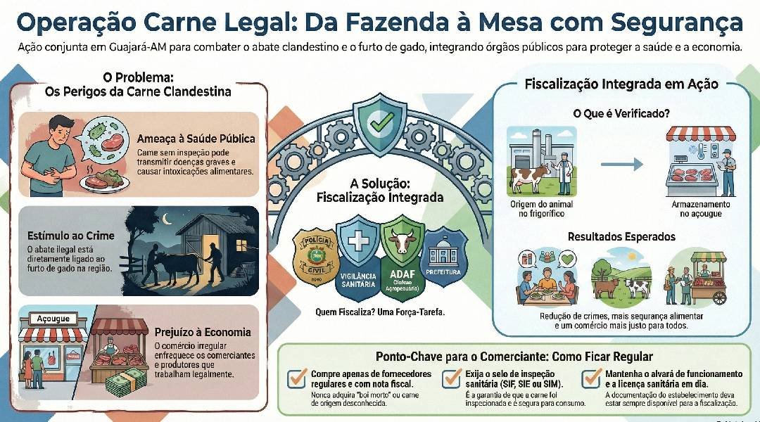 A Polícia Civil do Amazonas deu início à Operação Carne Legal no município de Guajará-AM, com o objetivo de combater o abate clandestino de animais, o furto de gado e a comercialização irregular de carne bovina, além de assegurar a proteção da saúde pública e da ordem econômica local.