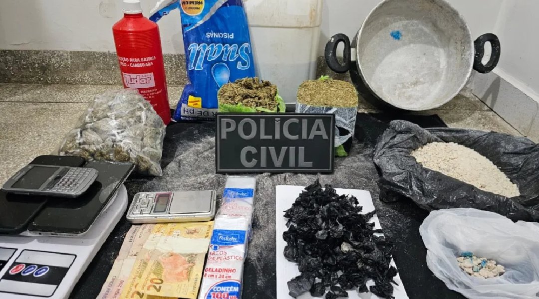 Na quarta-feira (21), a Polícia Civil efetuou a prisão de dois homens e a apreensão de um menor no bairro da Cohab, em Cruzeiro do Sul. Com eles, foram encontrados 1,3 quilo de maconha, 400 gramas de cocaína e oxidado, além de diversos materiais utilizados para a secagem, embalagem e pesagem das drogas.