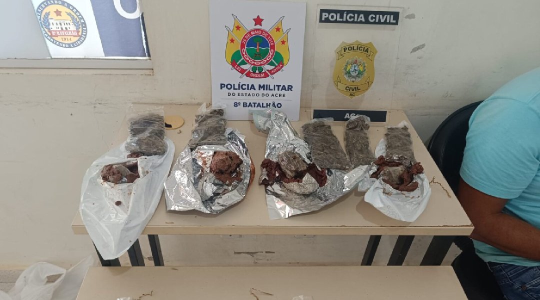 Após uma minuciosa revista, foram encontrados 13 pacotes de cocaína, totalizando 182 gramas, e 9 tabletes grandes de maconha, totalizando 682 gramas.