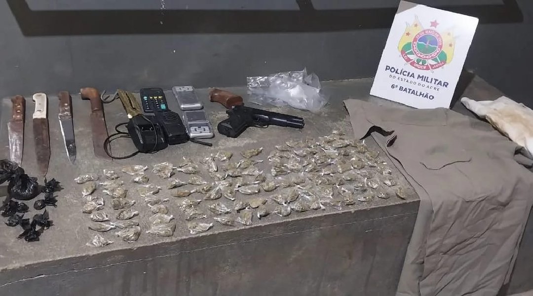 A Polícia Militar, através do 6° BPM, apreendeu drogas, facas, balança de precisão, rádio comunicador e um simulacro de arma de fogo em Cruzeiro do Sul. A ação ocorreu após a equipe ser acionada para atender uma ocorrência de tentativa de furto em uma loja de tintas no bairro COHAB.