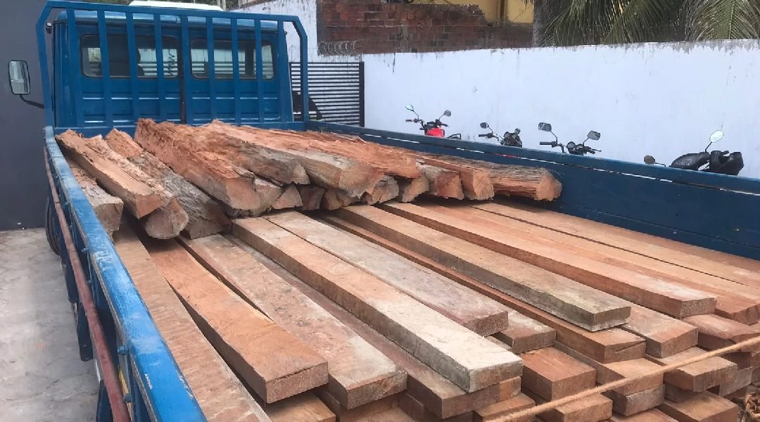 Ao abordar o veículo responsável pelo transporte da carga irregular, um caminhão azul com placa NAA OG14 da marca Mercedes, os agentes identificaram a carga ilegal, que consistia em 57 peças de 6 metros de Angelim e 20 esteios de Sapucaia.