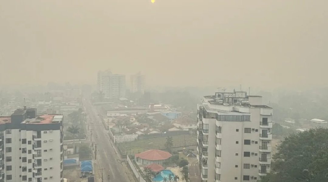 A capital do Acre, Rio Branco, vive mais um dia de poluição extrema, encoberta por uma espessa camada de fumaça resultante das queimadas e da seca intensa que assolam a região.