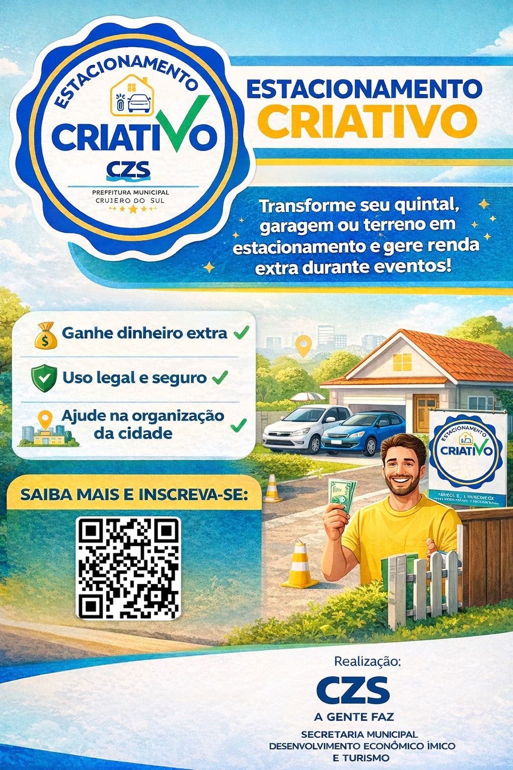 A Prefeitura de Cruzeiro do Sul vai implementar novamente o Programa Estacionamento Criativo durante o Carnaval Municipal 2026, que neste ano será realizado no centro da cidade. A iniciativa, coordenada pela Secretaria Municipal de Desenvolvimento Econômico e Turismo, tem como objetivo ampliar as opções de estacionamento, melhorar a mobilidade urbana e garantir geração de renda extra para a população durante o evento.