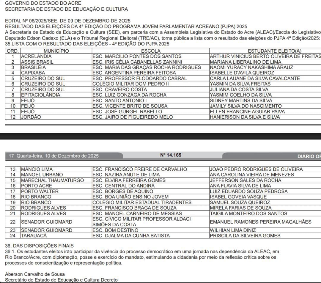 O resultado das eleições da 4ª edição do Programa Jovem Parlamentar Acreano (PJPA) foi publicado nesta quarta-feira, 10, no Diário Oficial do Estado. Alunos de 24 escolas da rede pública participaram da votação realizada na última sexta-feira, 5, escolhendo os estudantes que irão representar suas unidades de ensino na vivência do processo legislativo em 2025.