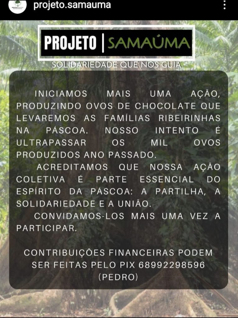 O projeto foi criado pelo delegado de Polícia Civil, Pedro Paulo Buzolin, e o promotor de Justiça, Fernando Cembranel. Familiares dos dois também participam, ajudando a produzir, montar, embalar e distribuir os ovos. Em sua segunda edição de Páscoa, o Projeto Samaúma vai distribuir 1,5 mil ovos para famílias ribeirinhas do Vale do Juruá e Rio Purus no interior do Acre.